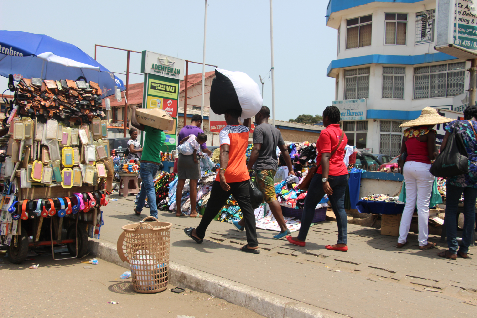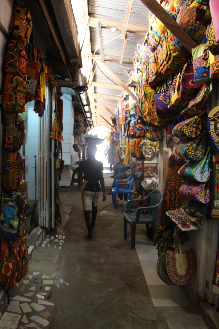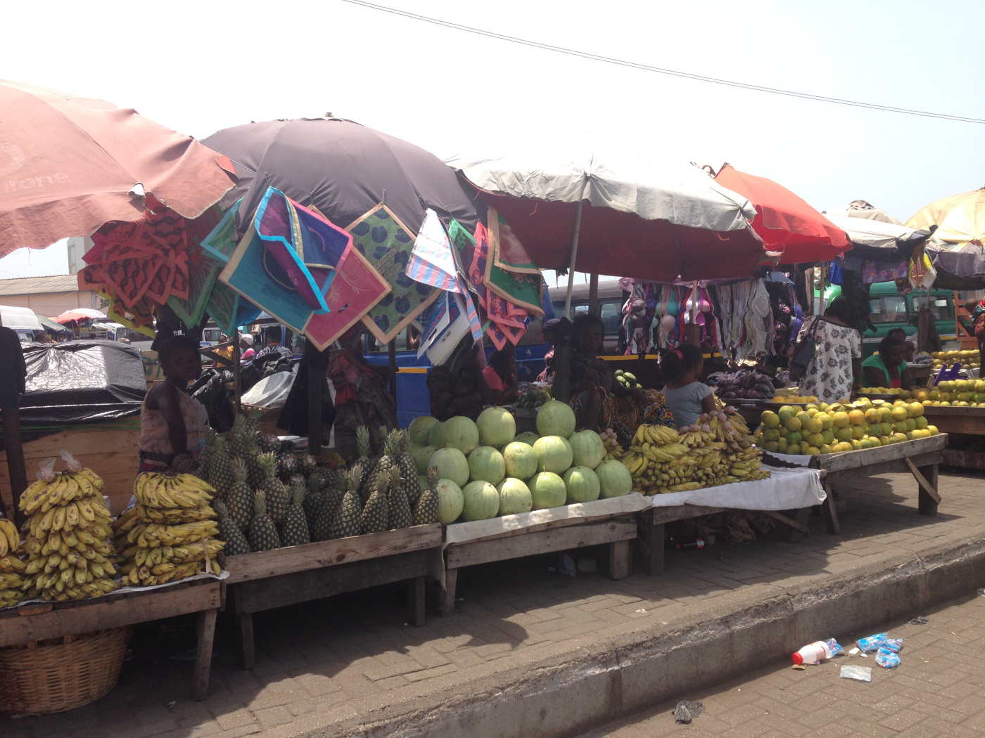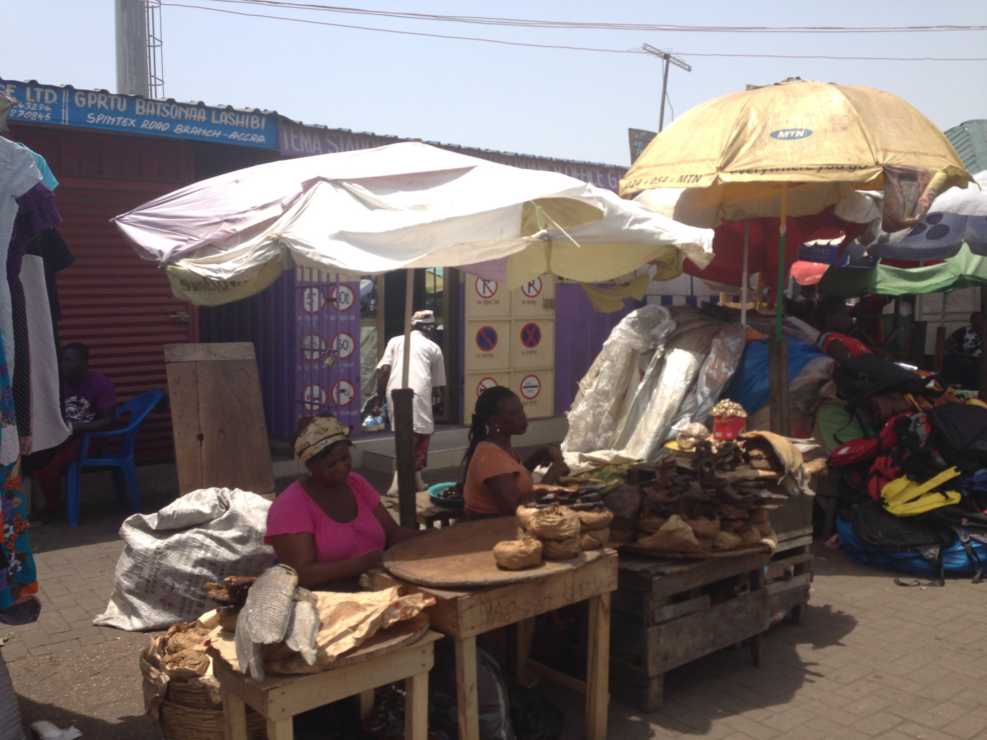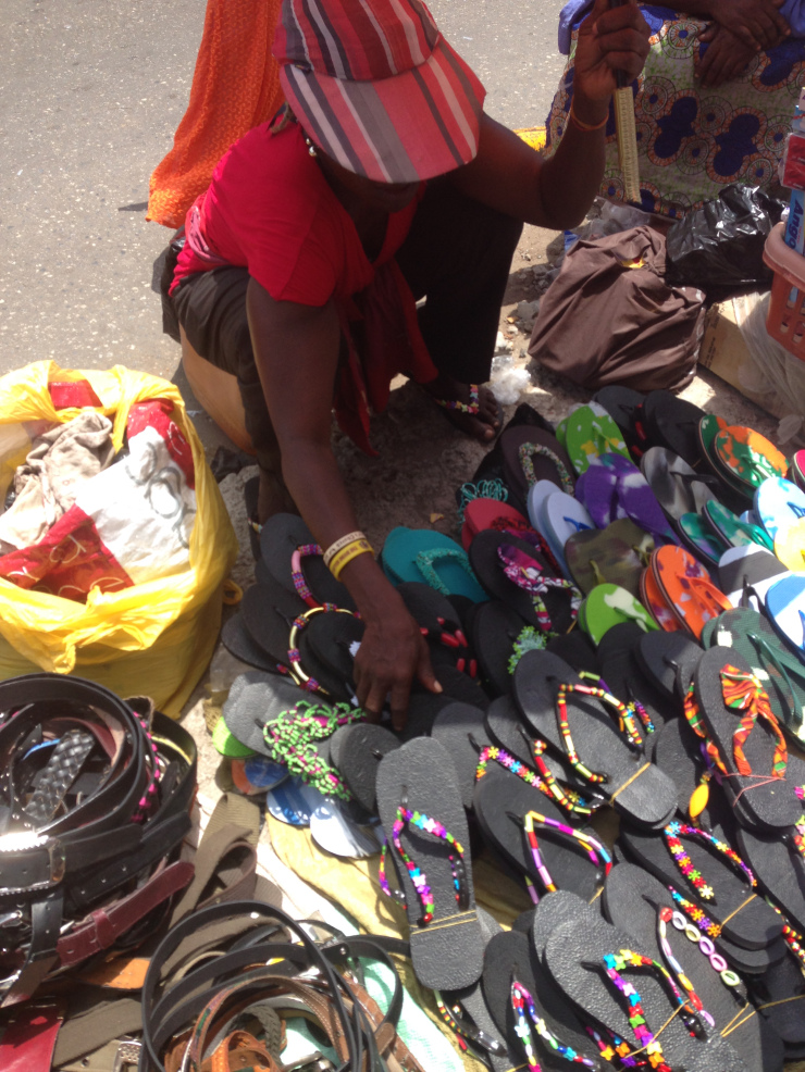 Ce marché est coloré et vivant. Aussitôt descendu du trotro nous avançons dans la gare où il y a des vendeurs de fripes, de babioles, de fruits et de légumes, de pains et de poissons séchés… Le tout dans le brouhaha du marché et les odeurs associées.