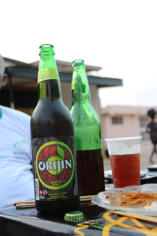 C’était une après-midi très instructive que nous avons terminé dans la joie et la bonne humeur en dégustant des brochettes d’akponti. Ce sont de succulentes brochettes de cabri. J’en ai profité pour découvrir quelques bières locales. C’était une petite ambiance maquis en plein air devant un kiosque où les hommes s’affairaient pour regarder un match de football. Nous étions en bordures de route et nous apprécions ce moment en toute convivialité !